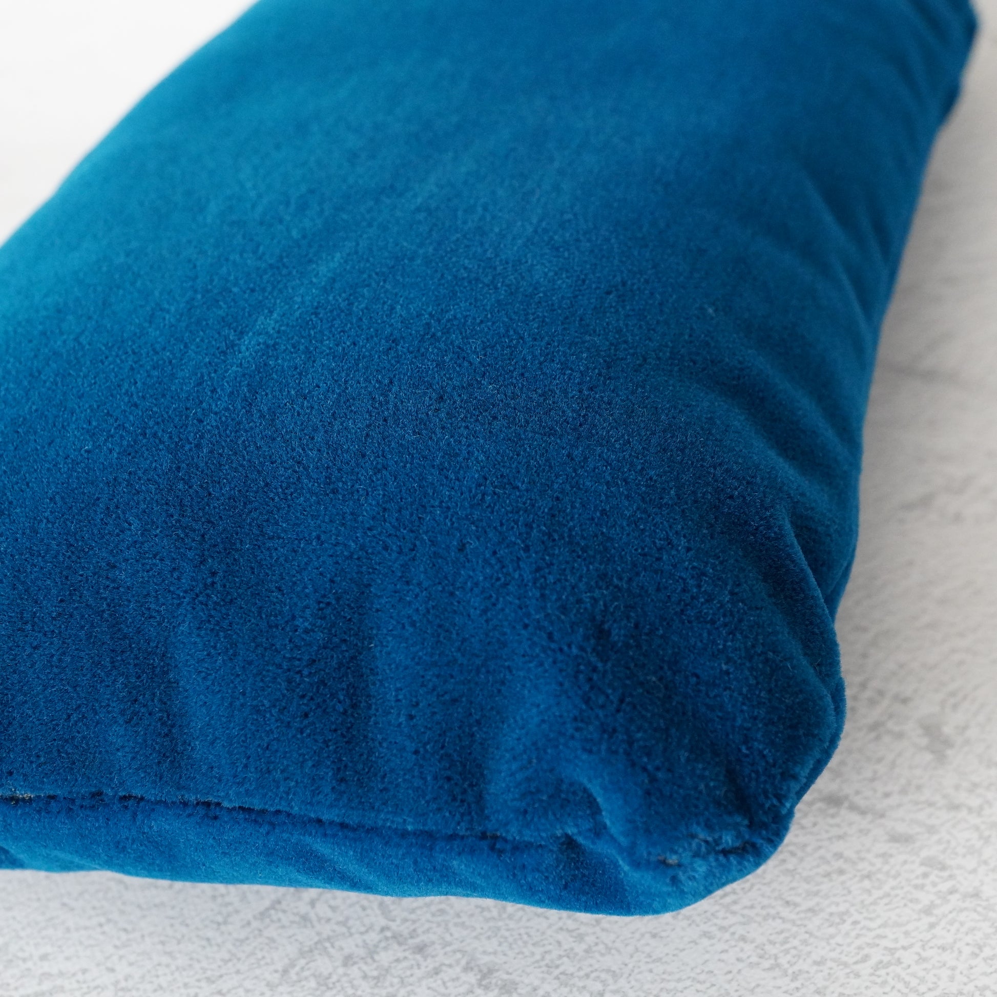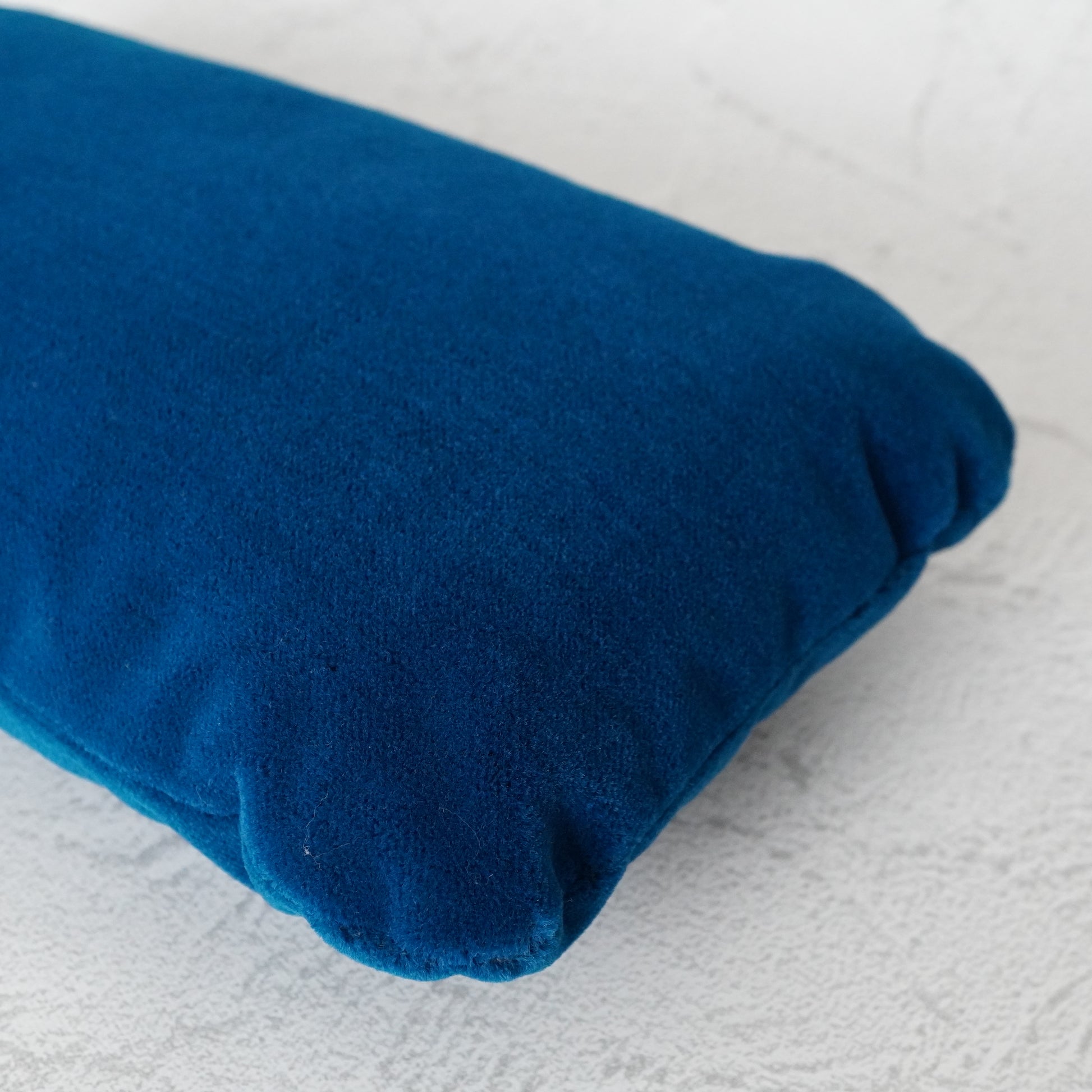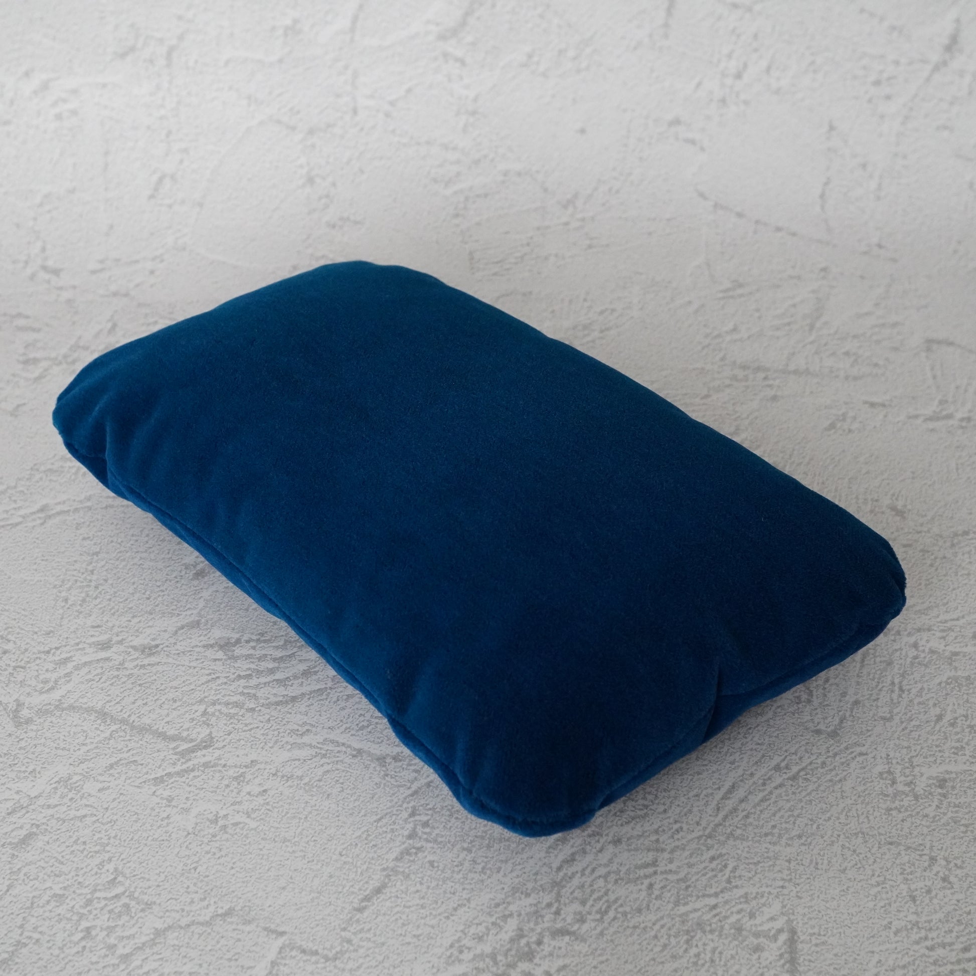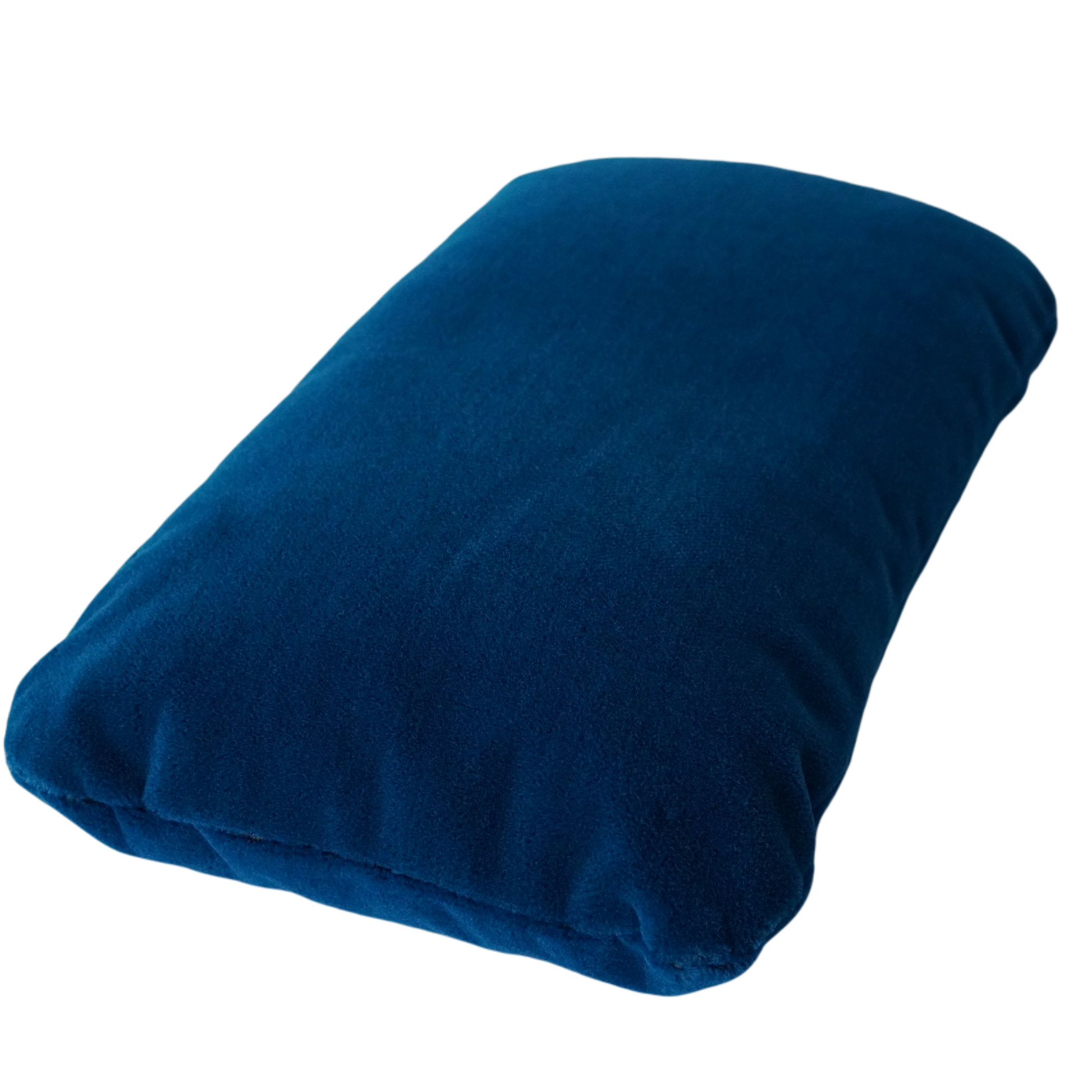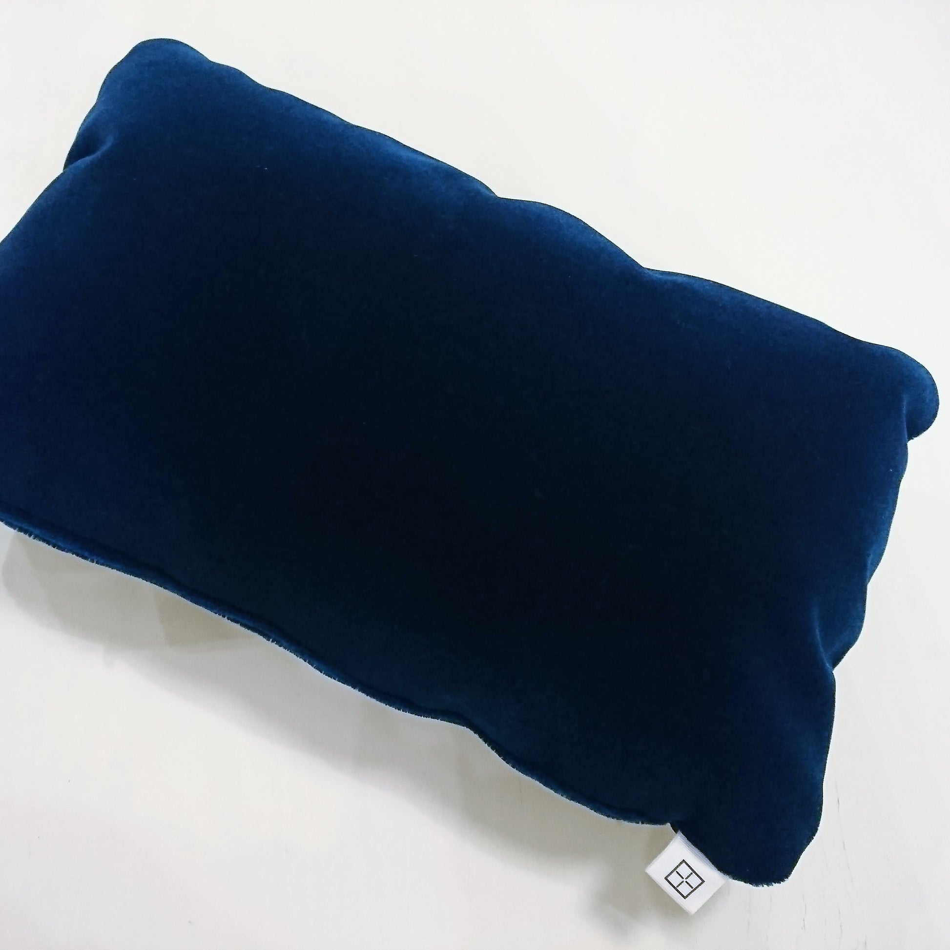 モケットで贅沢に全体を包んだ、使い勝手の良い形でミニサイズのクッションにしました。中材にポリエステル綿を多めに詰め、もちもちとした弾力ある仕上がりになりました。
