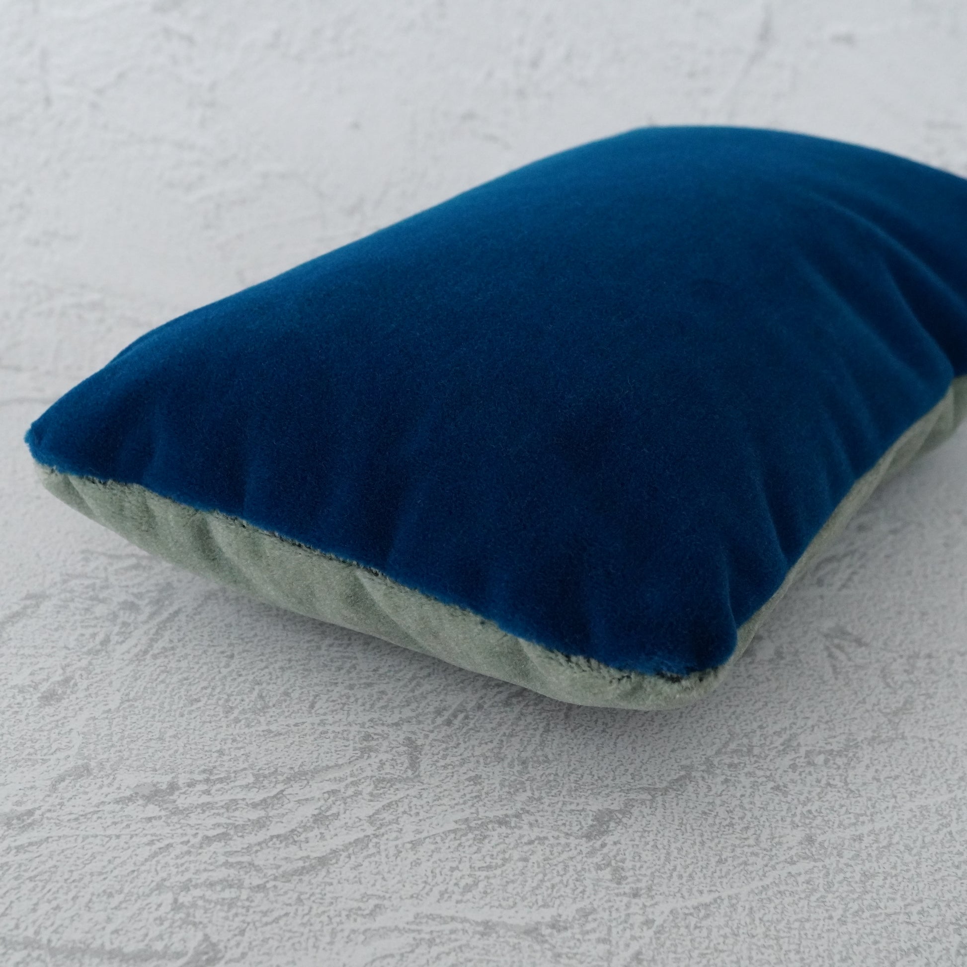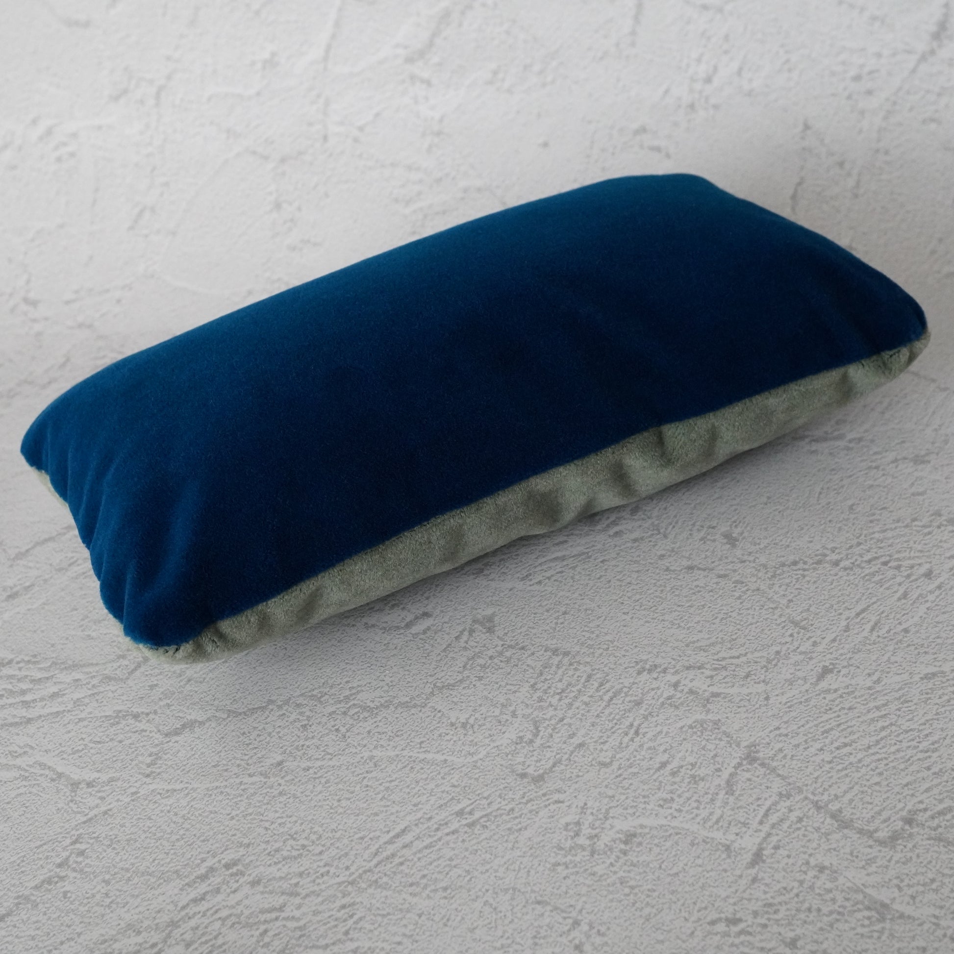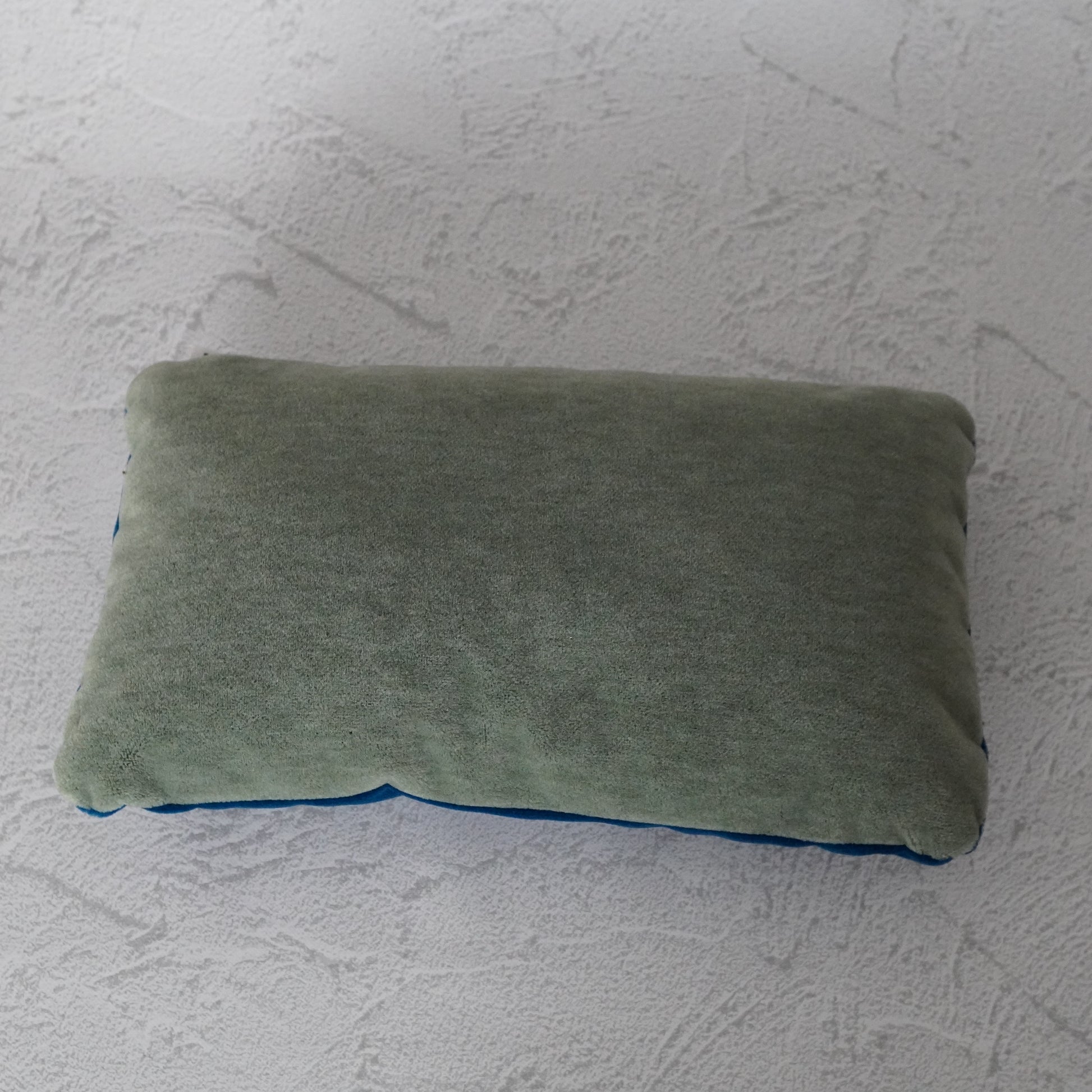 モケットで贅沢に全体を包み、使い勝手の良い形とミニサイズのクッションにしました。中材にポリエステル綿を多めに詰め、もちもちとした弾力ある仕上がりになりました。