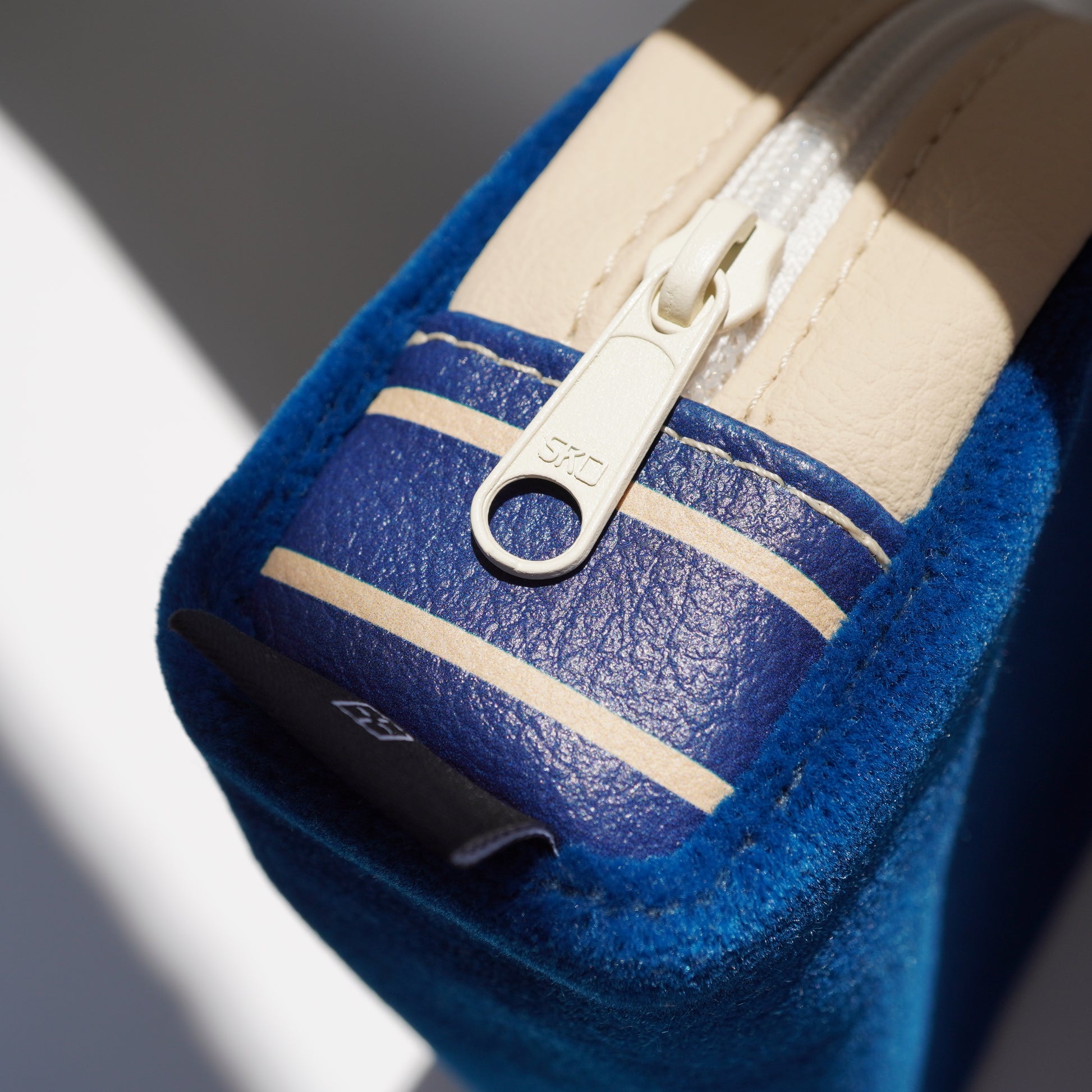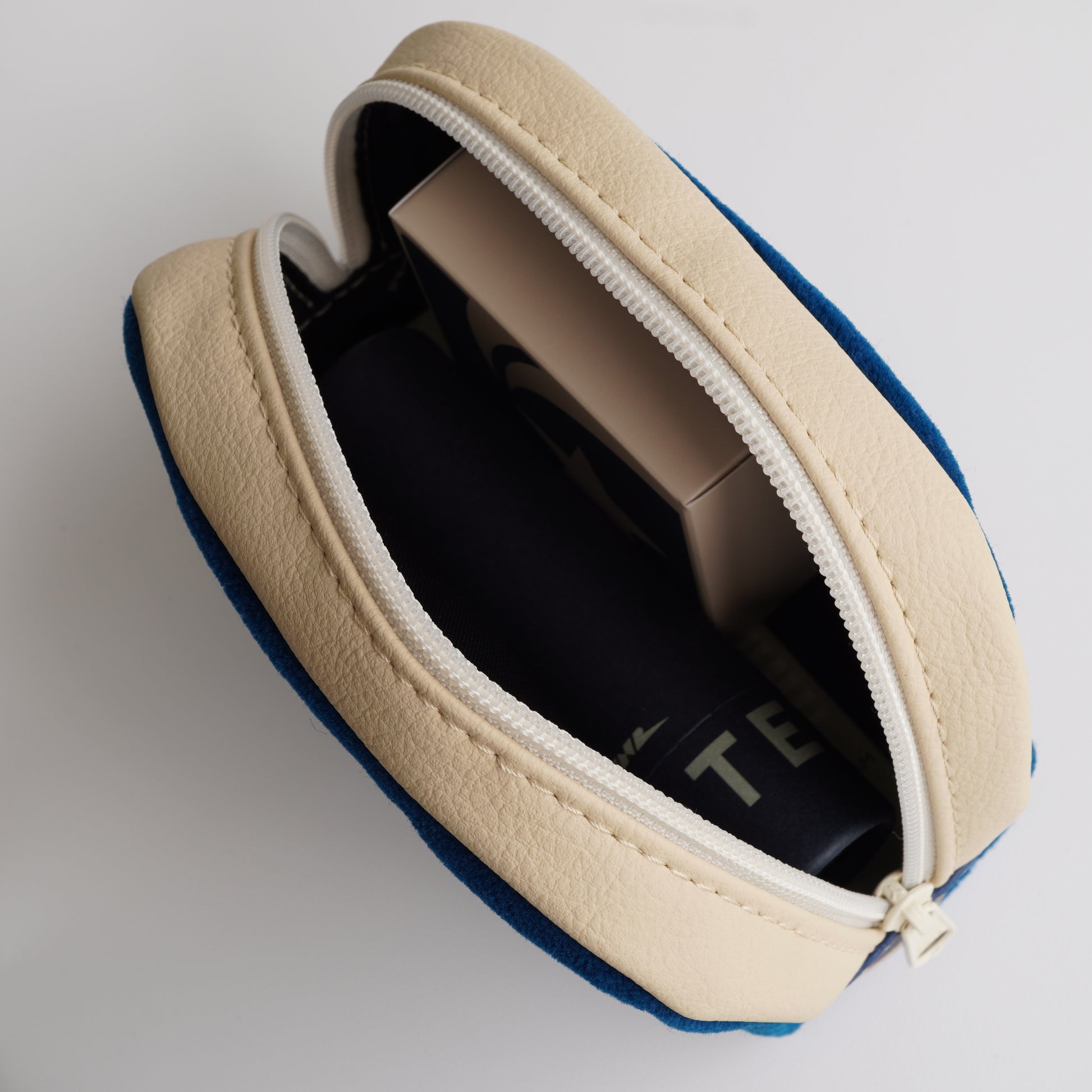 - コンパクトなコスメポーチで、レディースのハンドバッグにも入るサイズです。開口部は丈夫でお手入れのしやすいPVC素材で、内張も黒色クロスで汚れが目立ちません。ボディ部分は、色と感触が安らぐ青モケット。端部は、落ち着く藍色をベースに2本のクリーム色ストライプを入れました。