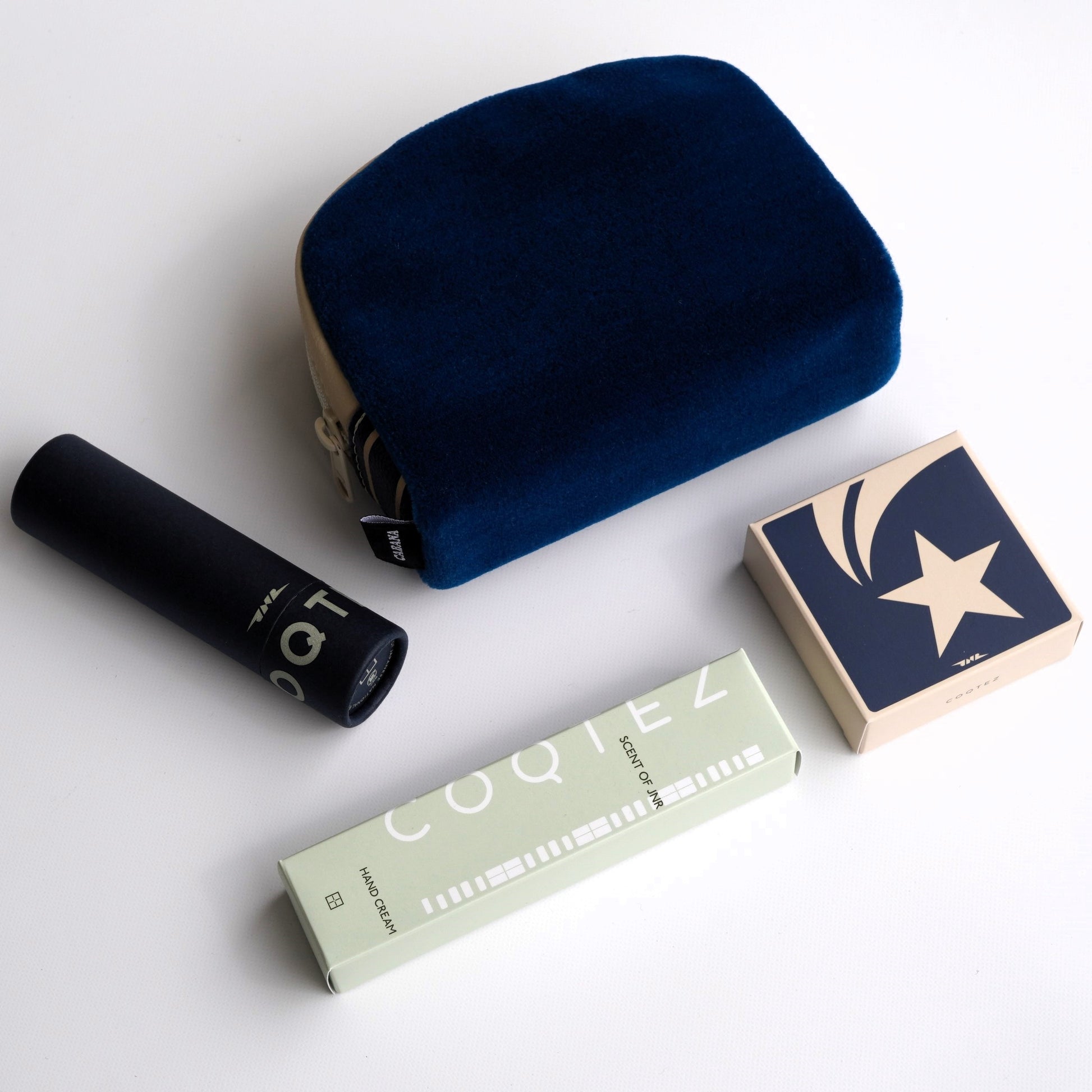 クラシックポーチ 青モケット、石鹸、ハンドクリーム、ルームミストに、COQTEZの世界観を楽しめる 1,100円 相当のカタログがプレゼントとして付属しています。